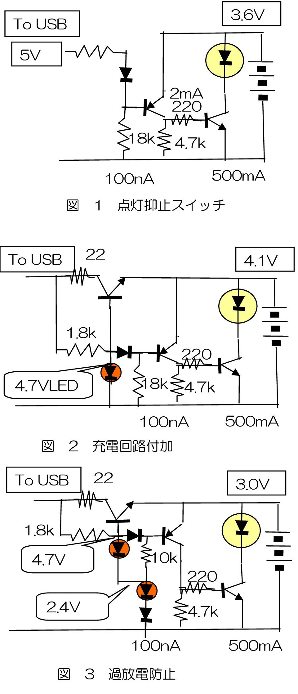 ニッケル水素電池は、使用可能電圧1.0V以下まで使用すると再充電が困難になります。照明用LEDも3V以下では電流が大きく減りますが、更に過放電を防止するため、3V以下では点灯スイッチに電流が流れないようにすることが効果的です。