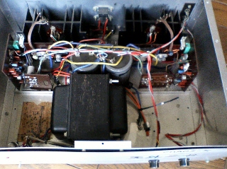 1 出力、電源電圧を決める スピーカにも依存しますが、一般的には、15W〜20Wの能力があれば十分です。 これは、整流後の電源を20V程度にすることで、整流すると1.4倍(21V超)になりますので、+15V、-15V(35VA 、または2〜3A)程度の電源用トランスを用意することを意味します。なお、電源は、+と―を使用しますので、アースラインに接続する中間タップがあるものにして下さい。 入手見込みのトランスを確認して決めると手戻りが少なくなります。 ここでは、簡略化のため、整流後の電源を20Vとして進めます。トランジスタによるオーディオアンプは、真空管に比べてこのように電圧が低いため、ほとんど感電して痺れることはありませんので、初心者でも安心して製作できます。 電源部を定電圧電源化しているマニアもおられるようですが、パワーアンプ自体が入力信号に従った電圧をスピーカに供給するバランス型の回路ですので、不要と考えて良いでしょう。電解コンデンサは、10,000μF程度にしましょう。最低、4,700μFは欲しいところです。大きくしすぎても効果は少なく、電源投入時の突入電流対策のため、ヒューズ容量を大きくすることになり、保護上、好ましくありません。ちなみ私は、4,700μFを2本並列に計4本使用しています。 |
